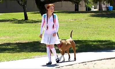Redhead cutie goes outdoors only to play around with her private parts