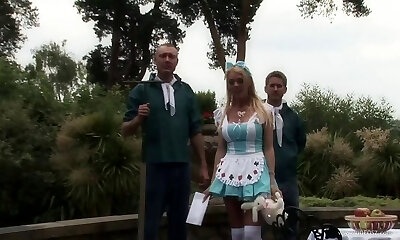 Horny babe with big tits gets fucked outdoors in an epic mmf three way