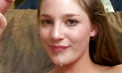 Cute slut takes dick in mouth, twat and bum then spunked on after sucking 2 dicks
