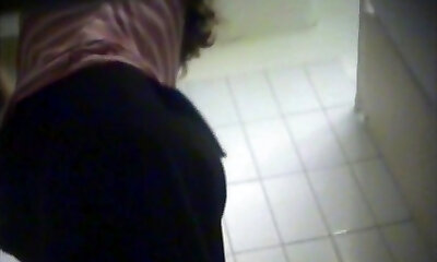 A milf is putting on a yellow striped bathing suit in the swimming pool switching room